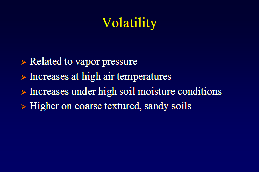 Volatility<BR>Related to vapor pressure <BR>Increases at high air temperatures <BR>Increases under high soil moisture conditions <BR>Higher on coarse textured, sandy soils <BR>