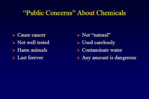 “Public Concerns” About Chemicals<BR>Cause cancer <BR>Not well tested <BR>Harm animals <BR>Last forever<BR>Not “natural” <BR>Used carelessly <BR>Contaminate water <BR>Any amount is dangerous<BR>