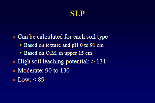 SLP<BR>Can be calculated for each soil type <BR>Based on texture and pH 0 to 91 cm <BR>Based on O.M. in upper 15 cm <BR>High soil leaching potential: > 131 <BR>Moderate: 90 to 130 <BR>Low: < 89 <BR>