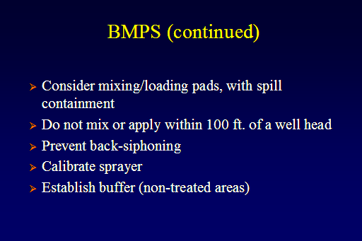 BMPS (continued)<BR>Consider mixing/loading pads, with spill containment <BR>Do not mix or apply within 100 ft. of a well head <BR>Prevent back-siphoning <BR>Calibrate sprayer <BR>Establish buffer (non-treated areas) <BR>