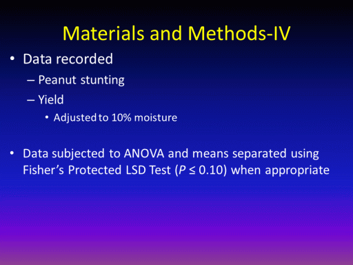 Materials and Methods-IV<BR>Data recorded <BR>Peanut stunting <BR>Yield <BR>Adjusted to 10% moisture <BR> <BR>Data subjected to ANOVA and means separated using Fisher’s Protected LSD Test (P = 0.10) when appropriate <BR> <BR> <BR> <BR>