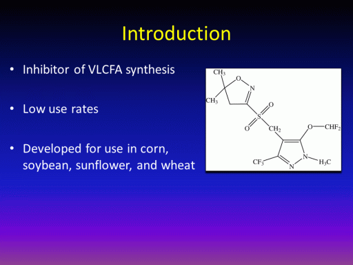 Introduction<BR>Inhibitor of VLCFA synthesis <BR> <BR>Low use rates <BR> <BR>Developed for use in corn, soybean, sunflower, and wheat <BR>