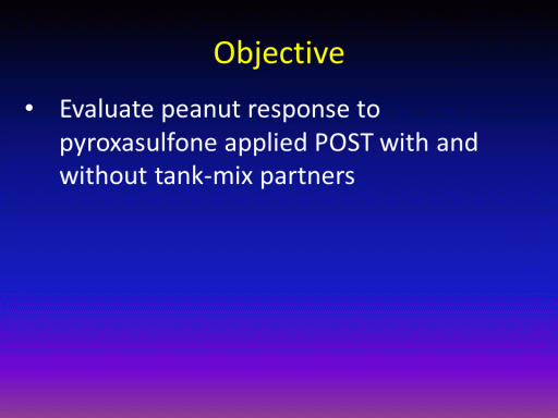 Objective<BR>Evaluate peanut response to pyroxasulfone applied POST with and without tank-mix partners <BR>	<BR>