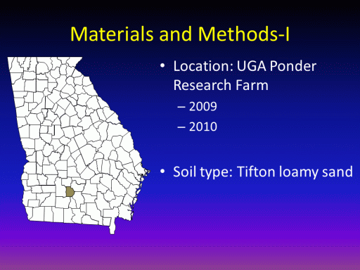 Materials and Methods-I<BR>Location: UGA Ponder Research Farm <BR>2009 <BR>2010 <BR> <BR>Soil type: Tifton loamy sand <BR> <BR> <BR> <BR> <BR> <BR>