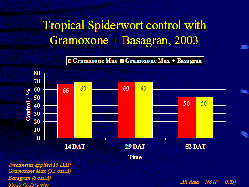 Tropical Spiderwort control with Gramoxone + Basagran, 2003<BR>Treatments applied 16 DAP