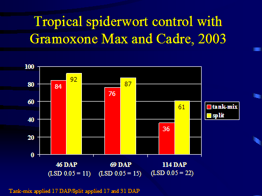 Tropical spiderwort control withGramoxone Max and Cadre, 2003<BR>Tank-mix applied 17 DAP/Split applied 17 and 31 DAP<BR>(LSD 0.05 = 11)<BR>(LSD 0.05 = 15)<BR>(LSD 0.05 = 22)<BR>