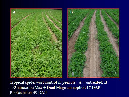 A<BR>B<BR>Tropical spiderwort control in peanuts.  A = untreated; B