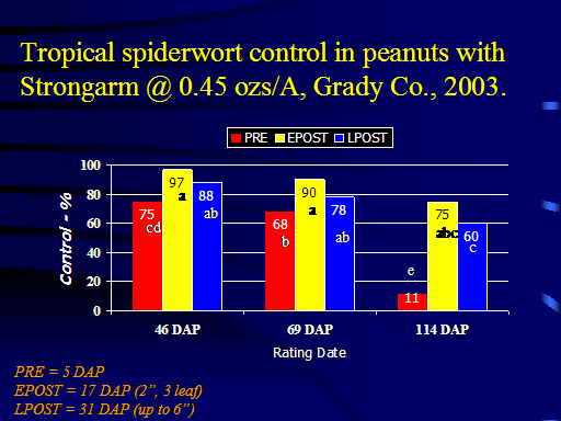 Tropical spiderwort control in peanuts with Strongarm @ 0.45 ozs/A, Grady Co., 2003.<BR>PRE = 5 DAP
