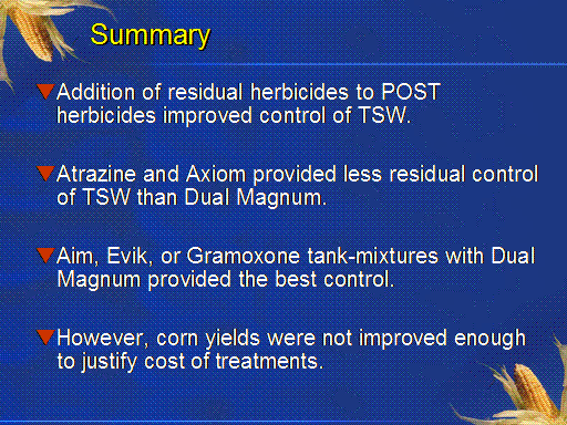 Summary<BR>Addition of residual herbicides to POST herbicides improved control of TSW. <BR> <BR>Atrazine and Axiom provided less residual control of TSW than Dual Magnum. <BR> <BR>Aim, Evik, or Gramoxone tank-mixtures with Dual Magnum provided the best control. <BR> <BR>However, corn yields were not improved enough to justify cost of treatments. <BR>