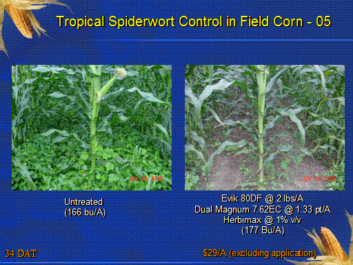 Tropical Spiderwort Control in Field Corn - 05<BR>Untreated <BR>(166 bu/A)<BR>Evik 80DF @ 2 lbs/A <BR>Dual Magnum 7.62EC @ 1.33 pt/A <BR>Herbimax @ 1% v/v <BR>(177 Bu/A)<BR>$29/A (excluding application)<BR>34 DAT<BR>