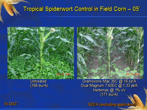 Tropical Spiderwort Control in Field Corn – 05’<BR>Untreated <BR>(166 bu/A)<BR>Gramoxone Max 3SC @ 16 oz/A <BR>Dual Magnum 7.62EC @ 1.33 pt/A <BR>Herbimax @ 1% v/v <BR>(171 bu/A)<BR>$22/A (excluding application)<BR>34 DAT<BR>