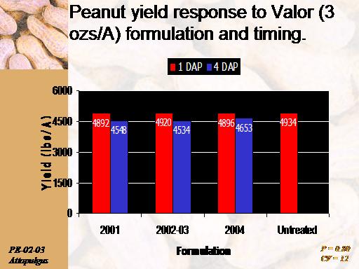 Peanut yield response to Valor (3 ozs/A) formulation and timing.<BR>PE-02-03