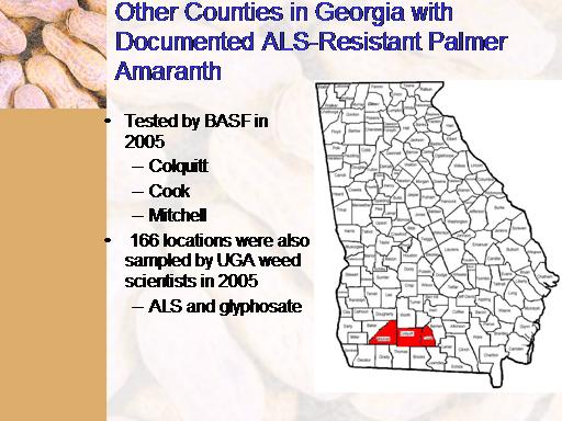 Other Counties in Georgia with Documented ALS-Resistant Palmer Amaranth<BR>Tested by BASF in 2005 <BR>Colquitt <BR>Cook <BR>Mitchell <BR> 166 locations were also sampled by UGA weed scientists in 2005 <BR>ALS and glyphosate<BR>*<BR>*<BR>*<BR>