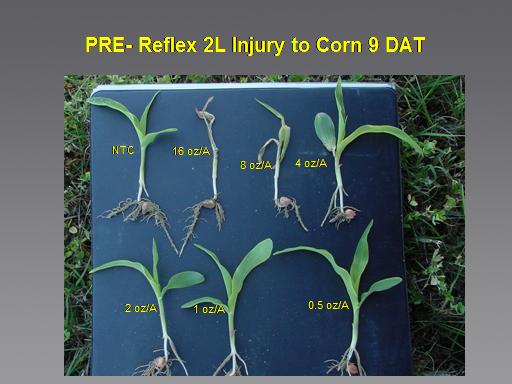 PRE- Reflex 2L Injury to Corn 9 DAT<BR>NTC<BR>16 oz/A<BR>8 oz/A<BR>4 oz/A<BR>2 oz/A<BR>1 oz/A<BR>0.5 oz/A<BR>