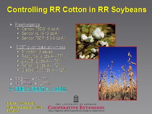 Controlling RR Cotton in RR Soybeans<BR>Preemergence <BR>Canopy 75DG (8 oz/A) <BR>Sencor 4L (8-12 oz/A)  <BR>Sencor 75DF (5.3-8 oz/A) <BR> <BR> POST glyphosate tank-mixes <BR>6” cotton, 3 leaves <BR>Resource (4 ozs/A) - 77% <BR>2,4-DB (2 ozs/A) -  76% <BR>Reflex (12 ozs/A) - 72% <BR>Classic (0.33 ozs/A) - 62% <BR> <BR>PRE only = 54-87% <BR>POST only = 62-77% <BR>PRE + POST =  > 95% <BR>Source:  York et al.,  <BR>Weed Technology.  2004.   <BR>532-539.<BR>