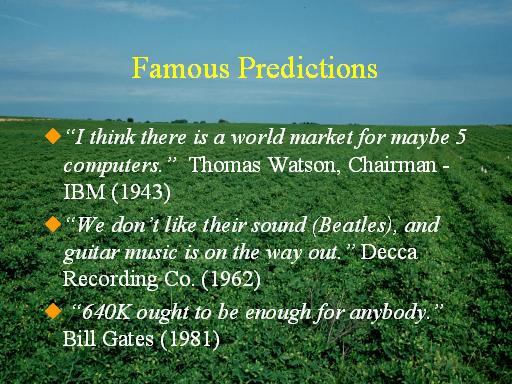 Famous Predictions<BR>“I think there is a world market for maybe 5 computers.”  Thomas Watson, Chairman - IBM (1943)