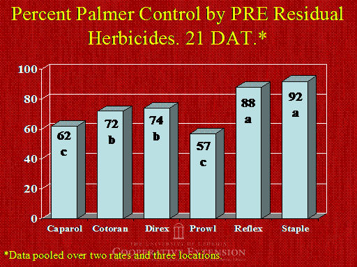 *Data pooled over two rates and three locations.<BR>Percent Palmer Control by PRE Residual Herbicides. 21 DAT.*  <BR>62 c<BR>72 b<BR>74 b<BR>57 c<BR>88 a<BR>92 a<BR>