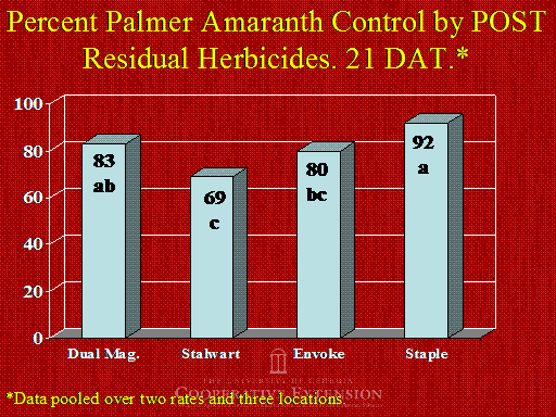 *Data pooled over two rates and three locations.<BR>Percent Palmer Amaranth Control by POST  Residual Herbicides. 21 DAT.*  <BR>83 ab<BR>69 c<BR>80 bc<BR>92 a<BR>