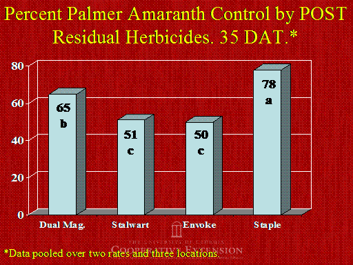 *Data pooled over two rates and three locations.<BR>Percent Palmer Amaranth Control by POST  Residual Herbicides. 35 DAT.*  <BR>65 b<BR>51 c<BR>50 c<BR>78 a<BR>