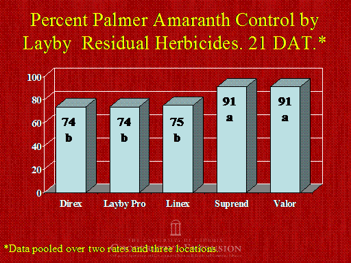 Percent Palmer Amaranth Control by Layby  Residual Herbicides. 21 DAT.*<BR>*Data pooled over two rates and three locations.<BR>74 b<BR>74 b<BR>75 b<BR>91 a<BR>91 a<BR>