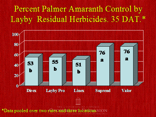 Percent Palmer Amaranth Control by Layby  Residual Herbicides. 35 DAT.*<BR>*Data pooled over two rates and three locations.<BR>53 b<BR>55 b<BR>51 b<BR>76 a<BR>76 a<BR>