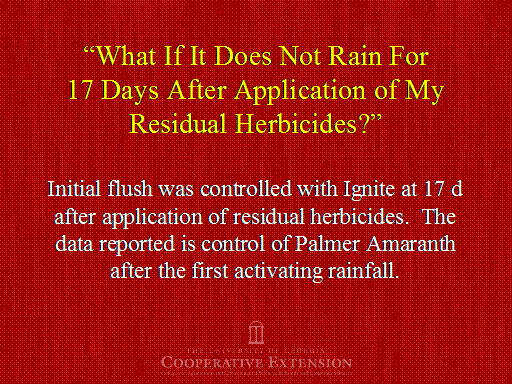 “What If It Does Not Rain For  17 Days After Application of My Residual Herbicides?”  Initial flush was controlled with Ignite at 17 d after application of residual herbicides.  The data reported is control of Palmer Amaranth after the first activating rainfall.<BR>