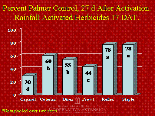 *Data pooled over two rates.<BR>30 d<BR>60 b<BR>55 b<BR>44 c<BR>78 a<BR>78 a<BR>Percent Palmer Control, 27 d After Activation.  Rainfall Activated Herbicides 17 DAT.<BR>