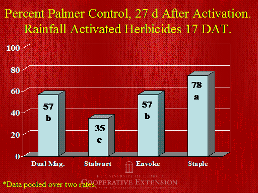 *Data pooled over two rates.<BR>57 b<BR>35 c<BR>57 b<BR>78 a<BR>Percent Palmer Control, 27 d After Activation.  Rainfall Activated Herbicides 17 DAT.<BR>