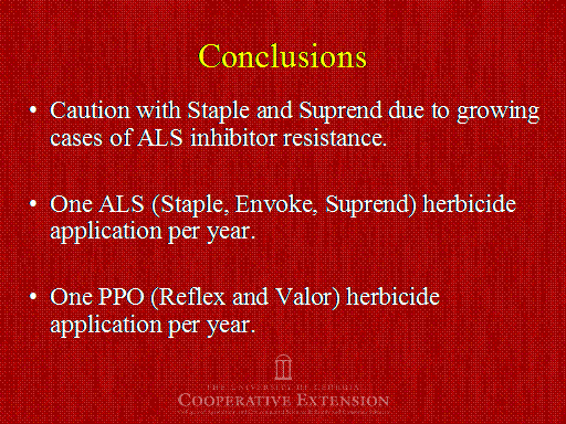 Conclusions<BR>Caution with Staple and Suprend due to growing cases of ALS inhibitor resistance. <BR> <BR>One ALS (Staple, Envoke, Suprend) herbicide application per year. <BR> <BR>One PPO (Reflex and Valor) herbicide application per year.  <BR> <BR>
