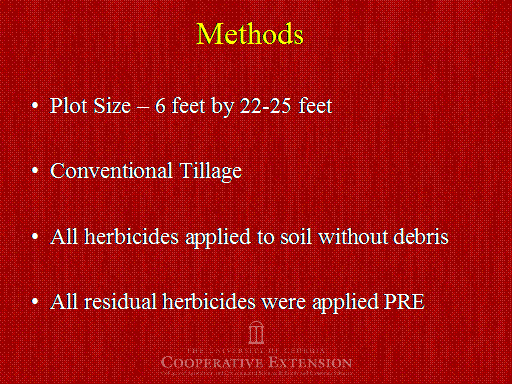 Methods<BR> <BR>Plot Size – 6 feet by 22-25 feet <BR> <BR>Conventional Tillage <BR> <BR>All herbicides applied to soil without debris <BR> <BR>All residual herbicides were applied PRE <BR> <BR> <BR>