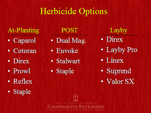 Herbicide Options<BR>Caparol <BR>Cotoran <BR>Direx <BR>Prowl <BR>Reflex <BR>Staple <BR> <BR>Direx <BR>Layby Pro <BR>Linex <BR>Suprend  <BR>Valor SX<BR>Dual Mag. <BR>Envoke <BR>Stalwart <BR>Staple <BR>At-Planting<BR>POST<BR>Layby<BR>