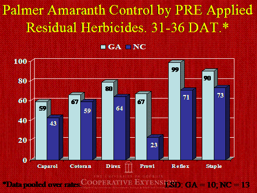 *Data pooled over rates.<BR>Palmer Amaranth Control by PRE Applied Residual Herbicides. 31-36 DAT.*  <BR>LSD: GA = 10; NC = 13<BR>