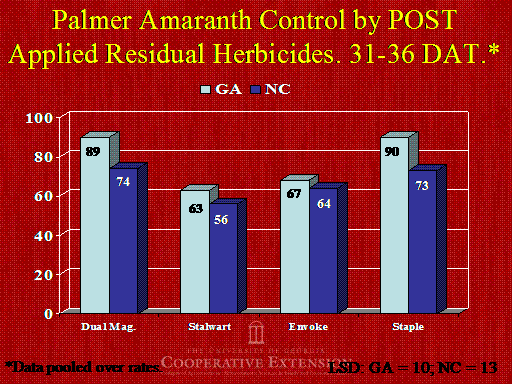 *Data pooled over rates.<BR>Palmer Amaranth Control by POST Applied Residual Herbicides. 31-36 DAT.*  <BR>LSD: GA = 10; NC = 13<BR>