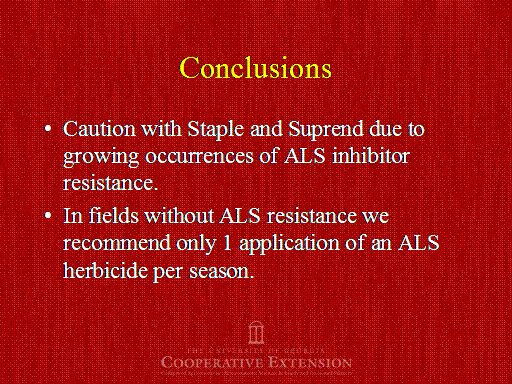 Conclusions<BR>Caution with Staple and Suprend due to growing occurrences of ALS inhibitor resistance. <BR>In fields without ALS resistance we recommend only 1 application of an ALS herbicide per season.<BR>