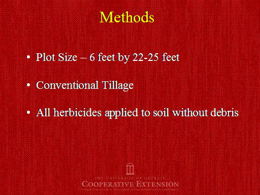 Methods<BR> <BR>Plot Size – 6 feet by 22-25 feet <BR> <BR>Conventional Tillage <BR> <BR>All herbicides applied to soil without debris <BR> <BR>