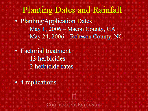 Planting Dates and Rainfall<BR>Planting/Application Dates  <BR>		May 1, 2006 – Macon County, GA <BR>		May 24, 2006 – Robeson County, NC <BR>Factorial treatment <BR>13 herbicides <BR>2 herbicide rates <BR> <BR>4 replications <BR> <BR>
