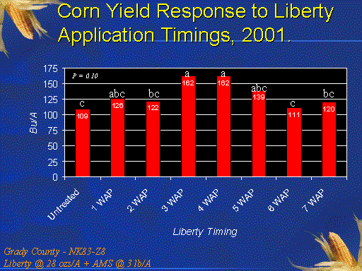 Corn Yield Response to Liberty Application Timings, 2001.<BR>Grady County - NK83-Z8