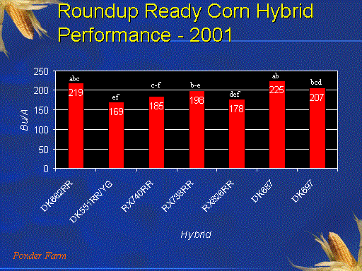 Roundup Ready Corn Hybrid Performance - 2001<BR>Ponder Farm<BR>abc<BR>ef<BR>c-f<BR>b-e<BR>def<BR>ab<BR>bcd<BR>