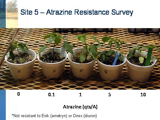 Site 5 – Atrazine Resistance Survey<BR>0.1<BR>1<BR>5<BR>10<BR>0<BR>Atrazine (qts/A)<BR>*Not resistant to Evik (ametryn) or Direx (diuron)<BR>