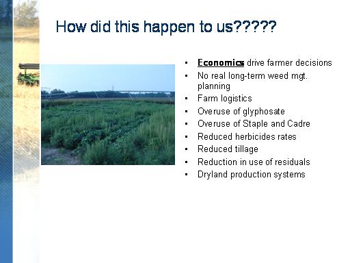 How did this happen to us?????<BR>Economics drive farmer decisions <BR>No real long-term weed mgt. planning <BR>Farm logistics <BR>Overuse of glyphosate <BR>Overuse of Staple and Cadre <BR>Reduced herbicides rates <BR>Reduced tillage <BR>Reduction in use of residuals <BR>Dryland production systems<BR>