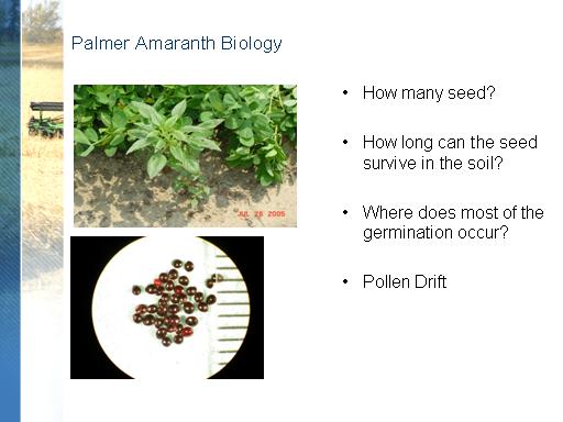 Palmer Amaranth Biology<BR>How many seed? <BR> <BR>How long can the seed survive in the soil? <BR> <BR>Where does most of the germination occur? <BR> <BR>Pollen Drift <BR>