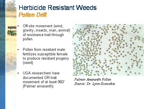 Herbicide Resistant Weeds Pollen Drift<BR>Off-site movement (wind, gravity, insects, man, animal) of resistance trait through pollen <BR> <BR>Pollen from resistant male fertilizes susceptible female to produce resistant progeny (seed) <BR> <BR>UGA researchers have documented GR-trait movement of at least 960’ (Palmer amaranth).<BR>Palmer Amaranth Pollen <BR>Source: Dr. Lynn Sosnoskie<BR>