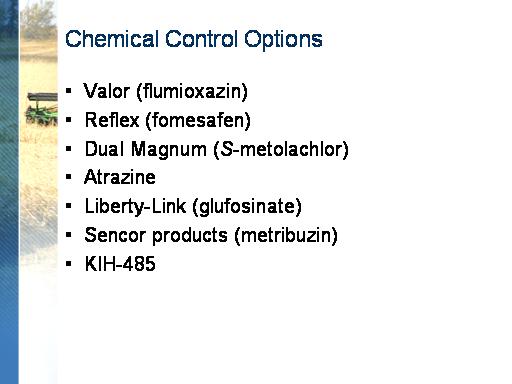 Chemical Control Options<BR>Valor (flumioxazin) <BR>Reflex (fomesafen) <BR>Dual Magnum (S-metolachlor) <BR>Atrazine <BR>Liberty-Link (glufosinate) <BR>Sencor products (metribuzin) <BR>KIH-485<BR>