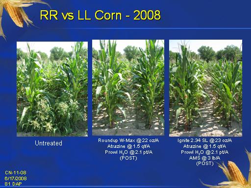 RR vs LL Corn - 2008<BR>Untreated<BR>Roundup W-Max @ 22 oz/A <BR>Atrazine @ 1.5 qt/A <BR>Prowl H2O @ 2.1 pt/A <BR>(POST)<BR>Ignite 2.34 SL @ 23 oz/A <BR>Atrazine @ 1.5 qt/A <BR>Prowl H2O @ 2.1 pt/A <BR>AMS @ 3 lb/A <BR>(POST)<BR>CN-11-08 <BR>6/17/2008 <BR>81 DAP<BR>