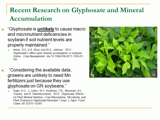 Recent Research on Glyphosate and Mineral Accumulation<BR>“Glyphosate is unlikely to cause macro and micronutrient deficiencies in soybean if soil nutrient levels are properly maintained.” <BR>Henry, R.S, K.A. Wise, and W.G. Johnson.  2011.  Glyphosate’s effect upon mineral accumulation in soybean.  Online.  Crop Management  doi:10.1094/CM-2011-1024-01-RS. <BR> <BR> “Considering the available data, growers are unlikely to need Mn fertilizers just because they use glyphosate on GR soybeans.” <BR>Duke, S.O., J. Lydon, W.C. Koskinen, T.B., Moorman, R.L. Chaney, and R. Hammerschmid.  2012.  Glyphosate Effects on Plant Mineral Nutrition, Crop Rhizosphere, Microbiota, and Plant Disease in Glyphosate-Resistant Crops. J. Agric. Food Chem. 60:10375-10397    <BR>