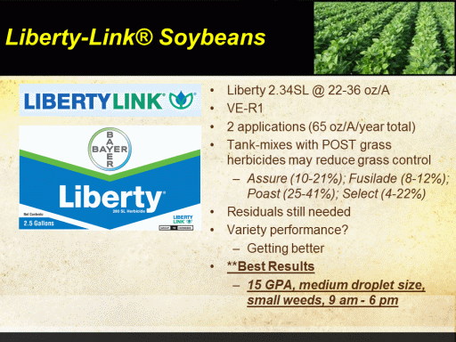 Liberty-LinkŪ Soybeans<BR>Liberty 2.34SL @ 22-36 oz/A <BR>VE-R1 <BR>2 applications (65 oz/A/year total) <BR>Tank-mixes with POST grass herbicides may reduce grass control   <BR>Assure (10-21%); Fusilade (8-12%); Poast (25-41%); Select (4-22%) <BR>Residuals still needed <BR>Variety performance? <BR>Getting better <BR>**Best Results <BR>15 GPA, medium droplet size, small weeds, 9 am - 6 pm <BR> <BR>