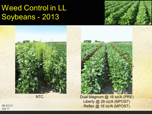 Weed Control in LL Soybeans - 2013<BR>SB-23-13 <BR>July 17<BR>NTC<BR>Dual Magnum @ 16 oz/A (PRE) <BR>Liberty @ 29 oz/A (MPOST) <BR>Reflex @ 16 oz/A (MPOST)<BR>