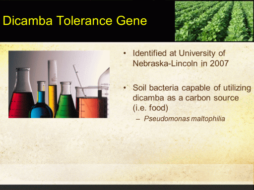 Dicamba Tolerance Gene<BR>Identified at University of Nebraska-Lincoln in 2007 <BR> <BR>Soil bacteria capable of utilizing dicamba as a carbon source (i.e. food) <BR>Pseudomonas maltophilia  <BR>