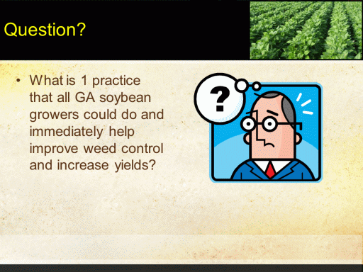 Question?<BR>What is 1 practice  that all GA soybean growers could do and immediately help improve weed control and increase yields?<BR>