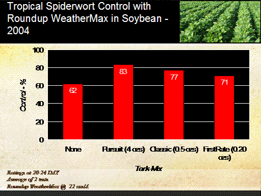 Tropical Spiderwort Control with Roundup WeatherMax in Soybean - 2004<BR>Ratings at 20-24 DAT <BR>Average of 2 tests <BR>Roundup WeatherMax @  22 ozs/A<BR>